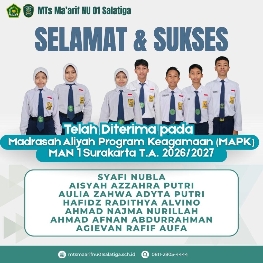 Kabar menggembirakan datang dari MTs Ma’arif NU 01 Salatiga. Sebanyak 7 murid terbaiknya berhasil lolos seleksi masuk MA PK MAN 1 Surakarta tahun ajaran 2026/2027. Hebatnya, seluruh pendaftar dari MTs Ma’arif NU 01 Salatiga dinyatakan diterima 100% (7 dari 7 murid). Prestasi ini semakin istimewa mengingat ketatnya persaingan dalam seleksi tersebut. Tercatat lebih dari 2.000 pendaftardari berbagai daerah turut bersaing untuk […]